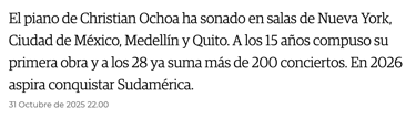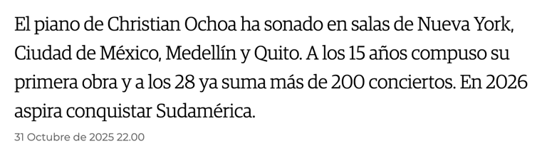 Christian Ochoa Carrasco, de 28 años, nació en Cuenca, pero vivió en Quito. Recuerda que desde pequeño le gustó abordar las obras de piano más complejas con gran gusto; su sensibilidad y talento le han permitido lograr el reconocimiento. “Las verdaderas obras de arte son inmortales, ellas nos cuentan las historias que todos hemos vivido en algún momento: amor, pasión, dolor, sufrimiento, angustia o felicidad... Cuando toco mis obras o las de compositores como Beethoven, Tchaikovsky, Chopin, Mozart, entre otros, busco que el público se pueda conectar a través de esas experiencias que también han vivido.”